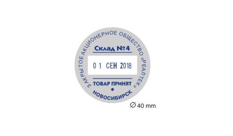 Датер с полем для текста, д. 40 мм. Прочный пластиковый корпус с автоматическим окрашиванием (с крышкой). Круглая текстовая плата под клише, сменная подушка синего цвета. Используется курьерскими и почтовыми службами.