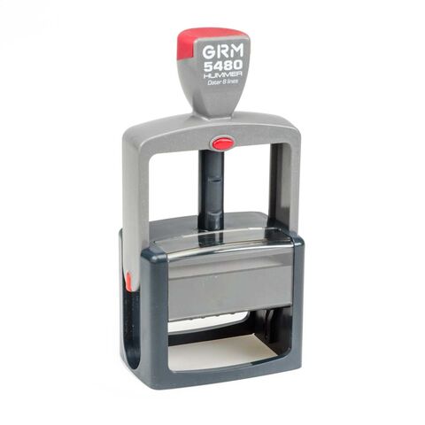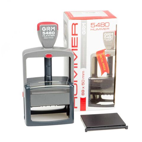 Профессиональный датер с цифровым обозначением месяца и полем для текстового клише GRM 5480 Hummer. Прочный пластиковый корпус с автоматическим окрашиванием усилен металлической осью.
