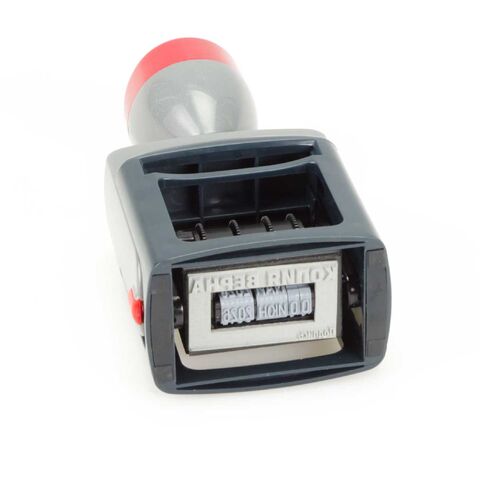 - Слегка нажмите на ручку штампа, опустив её примерно на 5-7 мм и зафиксируйте датер в полу-сложенном состоянии, нажав на кнопку на ручке