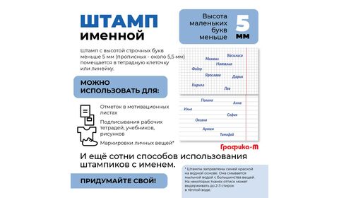 Маленький штампик с именем ребёнка можно использовать для маркировки тетрадей, учебников. Штампы подойдут для учеников, например, начальной школы, а так же для воспитанников детского сада. Размер оттиска штампиков подобран так, чтобы штамп помещался в строчку тетради. Маленькие буквы имени немного меньше, чем высота тетрадной клетки.