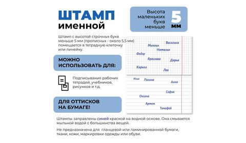 Маленький штампик с именем ребёнка можно использовать для маркировки тетрадей, учебников. Штампы подойдут для учеников, например, начальной школы, а так же для воспитанников детского сада. Размер оттиска штампиков подобран так, чтобы штамп помещался в строчку тетради. Маленькие буквы имени немного меньше, чем высота тетрадной клетки.