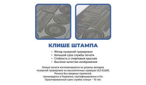 Штамп оснащён сменной штемпельной подушкой, заправленной синей краской на водной основе. Первичной заправки подушки хватает примерно до 2000 оттисков и больше. Возможна замена подушки на новую или её дозаправка штемпельной краской на водной основе.