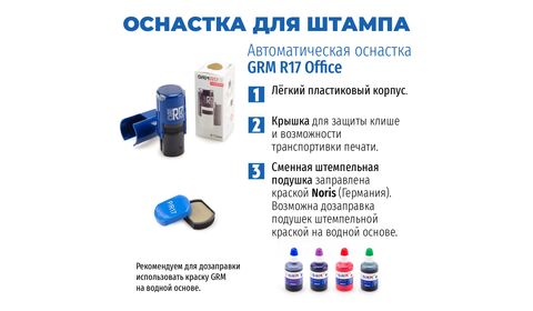 Будьте внимательны, крышка без дополнительного замка, она может открыться. Оснастка GRM с автоматическим окрашиванием предназначена для интенсивных условий эксплуатации, до 100 оттисков в день и больше.