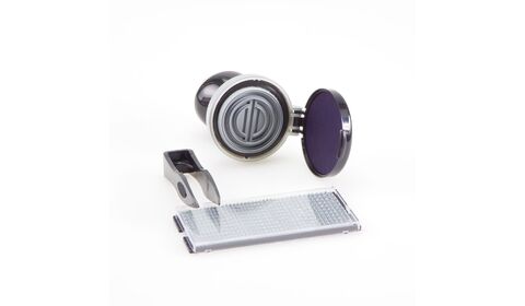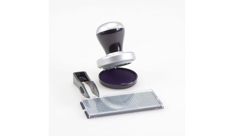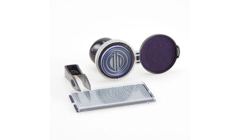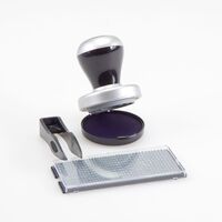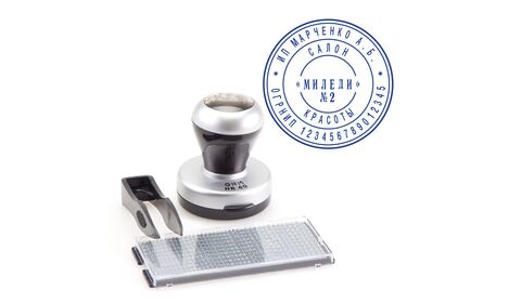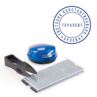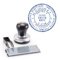 Самонаборная печать на пластиковой ручной оснастке GRM HR40 c рифлёной пластиной для самостоятельного изготовления печати. Штемпельная подушка встроена в крышку оснастки. Диаметр печати 40 мм. В комплекте одна касса символов ECONOM + пинцет. Крепление символов "одноножечное".