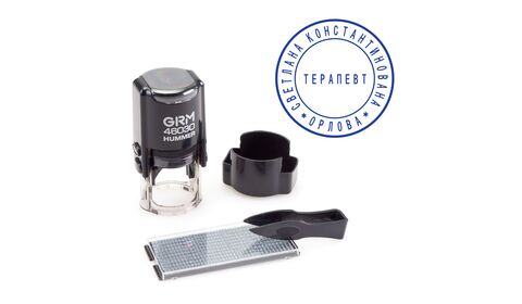 Текстовая рифлёная пластина самонаборной автоматической печати GRM 46030 HUMMER содержит один круг для набора текста. В центре печати три строки. Печати диаметром 30 мм могут использоваться для набора личной печати врача, учителя, а также для других печатей небольших диаметров – для пропусков, службы безопасности, охраны.