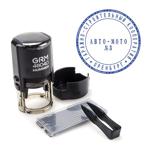 Автоматическая самонаборная печать на пластиковой оснастке GRM 46040 HUMMER оснащена рифлёной пластиной для самостоятельного изготовления печати. Диаметр печати 40 мм. В комплекте одна касса символов ECONOM + пинцет. Крепление символов "одноножечное".