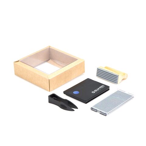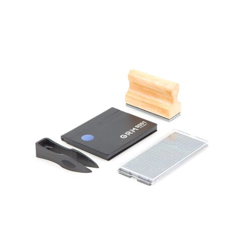 Самонаборный штамп на деревянной ручной оснастке оснащён резиновой рифлёной пластиной для набора текста. В комплект входит универсальная касса шрифта UNI-Set Эконом, пинцет и настольная штемпельная подушка.