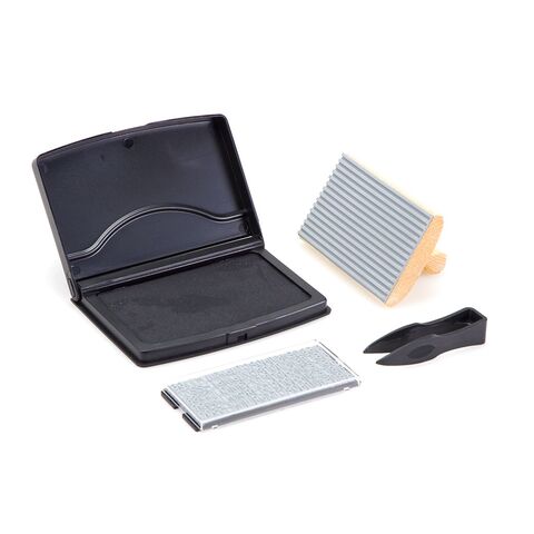 Самонаборный штамп на деревянной ручной оснастке оснащён резиновой рифлёной пластиной для набора текста. В комплект входит специальная касса увеличенного шрифта S7, пинцет и настольная штемпельная подушка.