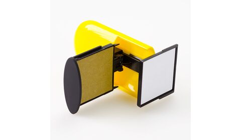 Компактная карманная оснастка GRM Pocket R40 ONE CLICK, д.40, жёлтый корпус с синей подушкой. Открывается и закрывается одним нажатием. Оригинальный дизайн, встроенная штемпельная подушка синего цвета. Для основной печати организации.