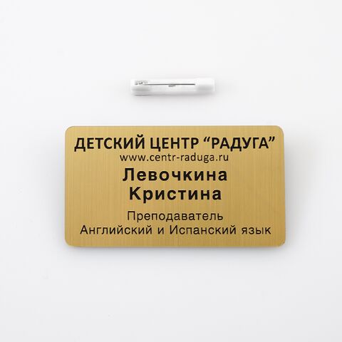 Нагрудный бейджик из двухслойного пластика, с булавкой для крепления.