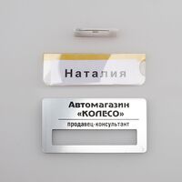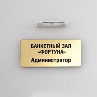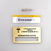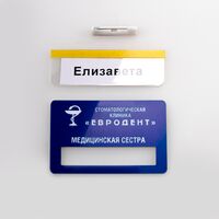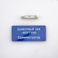 Нагрудный бейджик из двухслойного пластика, с булавкой для крепления.