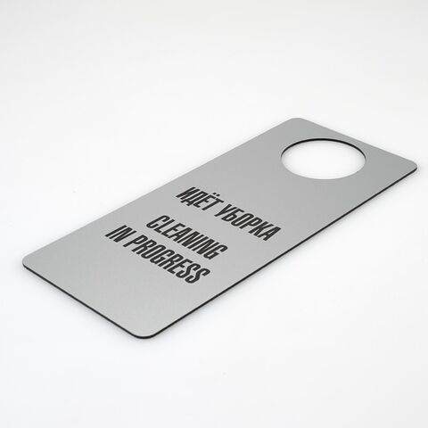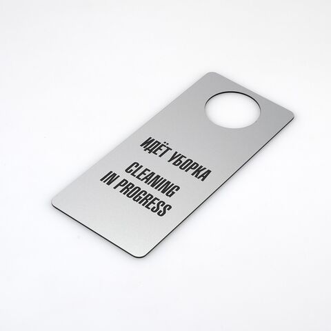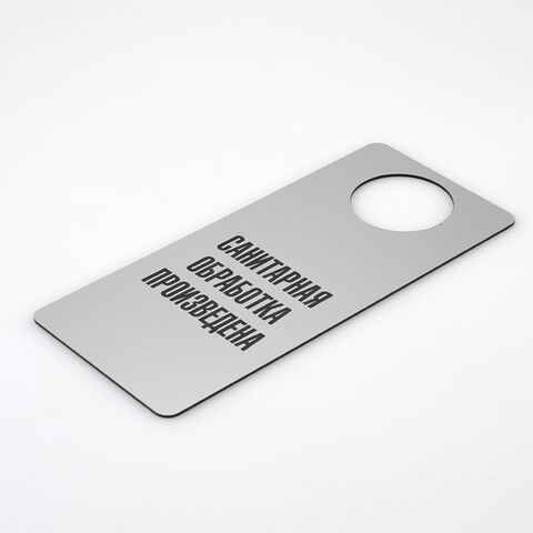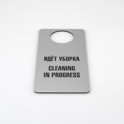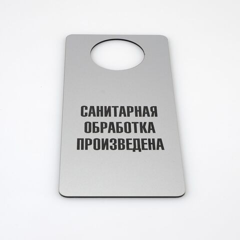 Табличка хенгер на ручку двери «Санитарная обработка произведена/Идет уборка, Cleaning in progress». Шаблон Xd1. Табличка двухсторонняя, толщина 3 мм. С одной стороны надпись - Санитарная обработка произведена, с другой - Идет уборка, Cleaning in progress.
