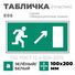Пластиковая табличка-указатель с изображением «Человечек, бегущий к отрытой двери в направлении стрелки направо и вверх по наклонной плоскости». Изображение выполнено белым цветом на зеленом фоне с белой рамкой по контуру.