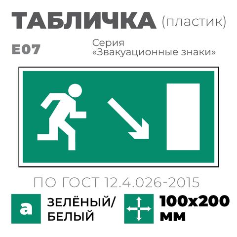 Табличка E07 (10х20 см) «Направление к эвакуационному выходу направо вниз»