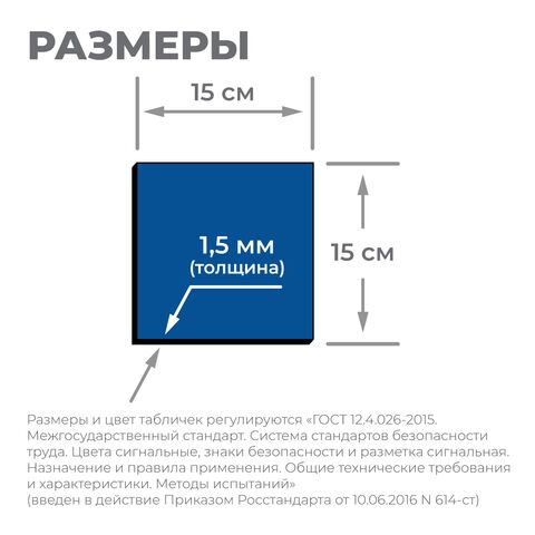 Изображения на табличках и их размер выполнены по рекомендациям «ГОСТ 12.4.026-2015. Межгосударственный стандарт. Система стандартов безопасности труда. Цвета сигнальные, знаки безопасности и разметка сигнальная. Назначение и правила применения. Общие технические требования и характеристики.» (введен в действие Приказом Росстандарта от 10.06.2016 N 614-ст).