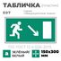 Пластиковая табличка-указатель с изображением «Человечек, бегущий к отрытой двери в направлении стрелки направо и вниз по наклонной плоскости». Изображение выполнено белым цветом на зеленом фоне с белой рамкой по контуру.