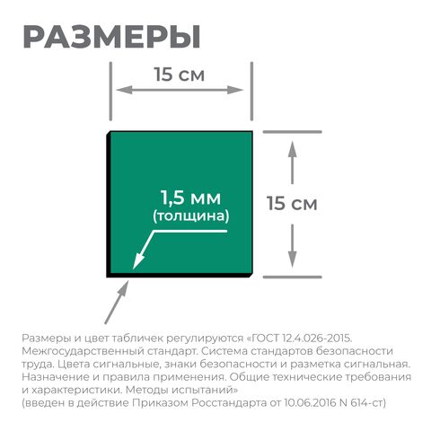 Изображения на табличках и их размер выполнены по рекомендациям «ГОСТ 12.4.026-2015. Межгосударственный стандарт. Система стандартов безопасности труда. Цвета сигнальные, знаки безопасности и разметка сигнальная. Назначение и правила применения. Общие технические требования и характеристики.» (введен в действие Приказом Росстандарта от 10.06.2016 N 614-ст).