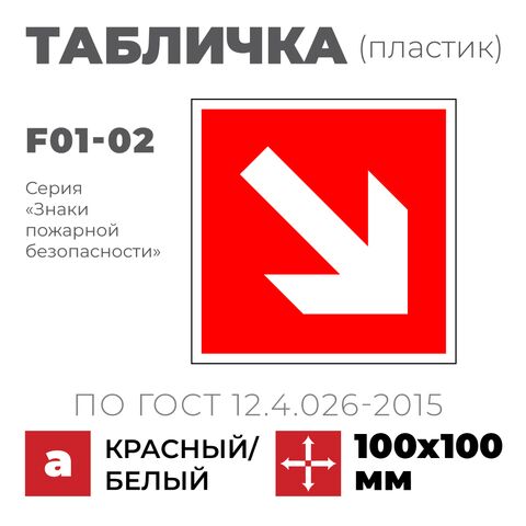 Табличка F01-02 «Направляющая стрелка под углом 45 градусов» относится к серии «Знаки пожарной безопасности».