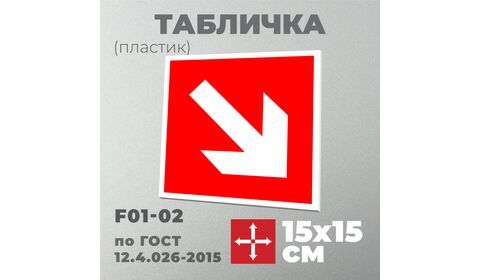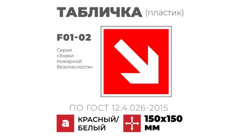 Табличка F01-02 «Направляющая стрелка под углом 45 градусов» относится к серии «Знаки пожарной безопасности».