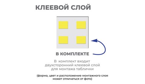 В комплекте прилагаются несколько двухсторонних клеевых элементов для крепления таблички на гладкую поверхность.