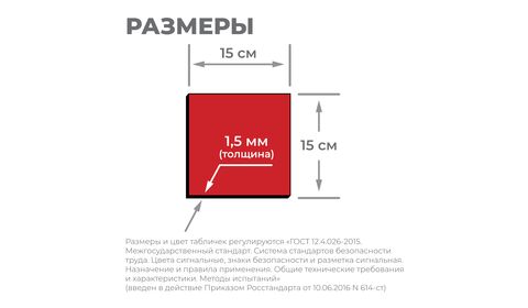 Изображения на табличках и их размер выполнены по рекомендациям «ГОСТ 12.4.026-2015. Межгосударственный стандарт. Система стандартов безопасности труда. Цвета сигнальные, знаки безопасности и разметка сигнальная. Назначение и правила применения. Общие технические требования и характеристики.» (введен в действие Приказом Росстандарта от 10.06.2016 N 614-ст).