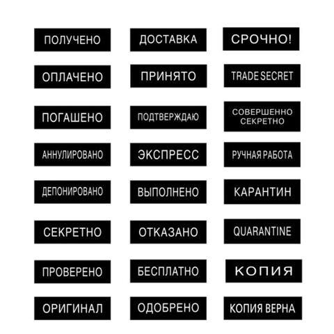 Стандартные штампы незаменимы в офисной работе. Часто используются при оформлении документов в отделе кадров, бухгалтерии, на складе, на кассах магазинов.