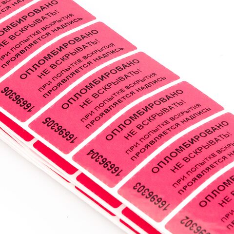 Пломба-наклейка, применяется для опломбирования, как индикатор вскрытия. При снятии пломбы на поверхности самой пломбы проявляется надпись (Вскрыто) и повторное использование пломбы невозможно. Каждая пломба-наклейка имеет индивидуальный номер.
