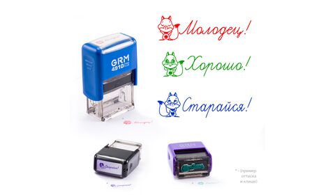 Комплект оценочных печатей для школы с рисунком, на автоматической оснастке GRM 4910 Plus со сменной штемпельной подушкой. Используется для краткой характеристики результатов учебного труда школьников.