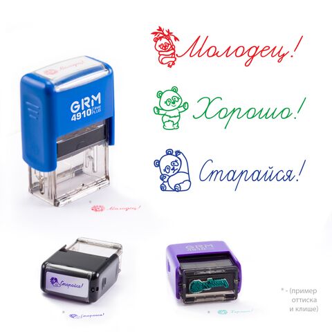 Комплект оценочных печатей для школы с рисунком, на автоматической оснастке GRM 4910 Plus со сменной штемпельной подушкой. Используется для краткой характеристики результатов учебного труда школьников.