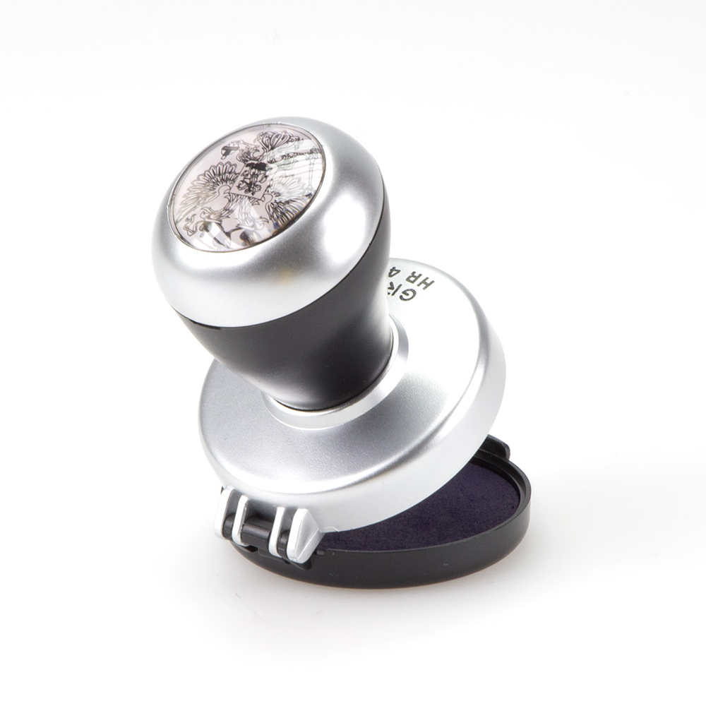 Пластиковая полуавтоматическая оснастка для печатей GRM HR45 Silver. Cо встроенной подушкой, д. 45 мм, серебристый корпус.